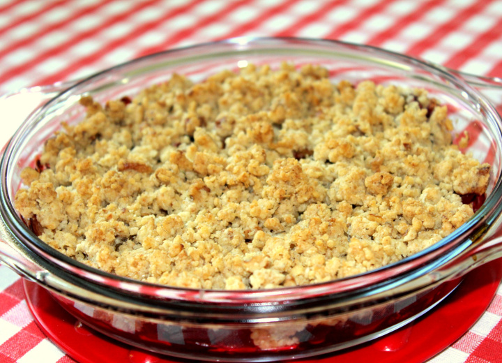 Im Backofen bei 180 Grad Heißluft ca. 30-35 Minuten backen, bis die Streusel anfangen, etwas braun zu werden. Das Crumble schmeckt warm am besten.