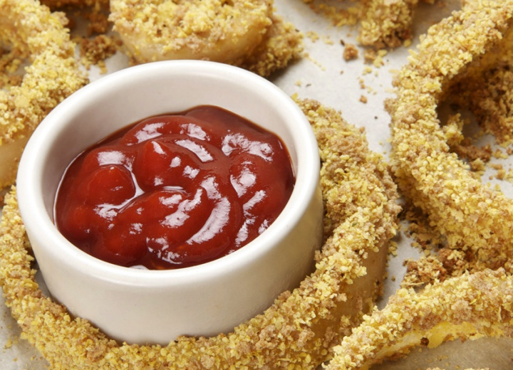Die Zwiebelringe auf das Backblech legen. 15 Minuten bei 200 Grad backen, wenden und weitere 15 Minuten backen. Für weichere, weniger knusprige Ringe die Backzeit verringern. Aus dem Ofen nehmen und mit Ketchup oder anderen Dips genießen.